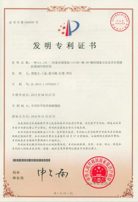 2月5日,由中科院华南植物园谭建文研究员等科研人员完成的“一种2α,3β-二羟基齐墩果烷-13(18)-烯-28-酸的制备方法及其在制备抗菌剂中的应用”获得国家发明专利授权(专利号:ZL 201310379435.7)。