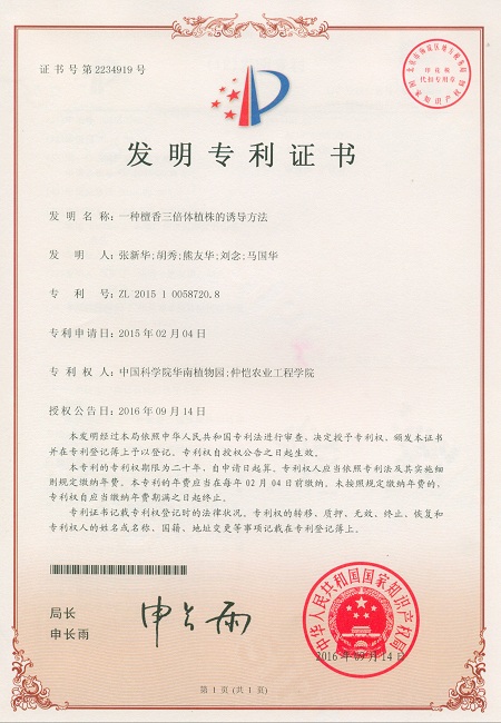 11月1日获悉,中科院华南植物园张新华、马国华等科研人员完成的“一种檀香三倍体植株的诱导方法”获得国家发明专利授权(专利号:ZL201510058720.8)。