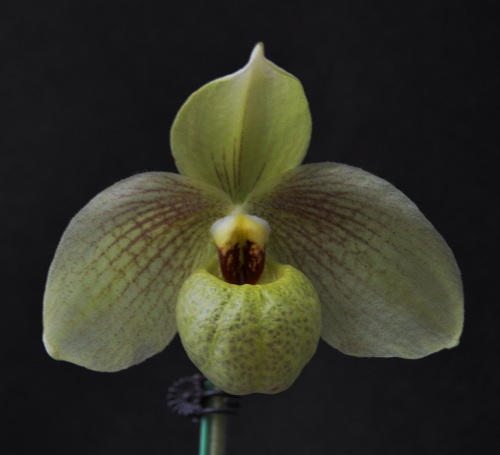 ‘绿韵兜兰’(Paphiopedilum ‘Lvyun’)是2006年以引进的麻栗坡兜兰‘MZ-1’(P. malipoense‘MZ -1’)为母本、白花兜兰‘EZ-1’(P. emersonii ‘EZ -1’)为父本进行杂交,经无菌播种繁殖而成的杂交一代品种。多年多点试验结果表明,其遗传性状稳定一致。‘绿韵兜兰’生长势旺盛,播种苗种植3年的开花植株,平均株高14.4厘米、株幅33.6厘米。叶片狭椭圆形,近革质,叶面浅绿色、具深绿色斑纹,叶背基部有紫色斑点,平均长17.8厘米、宽6.0厘米。花葶近直立、绿色,被白色长柔毛,平均长22.8厘米;花黄绿色,平均横径11.7厘米、纵径11.9厘米;中萼片卵状披针形,先端较尖;花瓣卵形,具褐紫色条纹和斑点;唇瓣深囊状,近球形,有褐紫色斑点。开花期12月至翌年3月,单花寿命35-40天。设施栽培条件下抗病性、抗逆性较强。‘绿韵兜兰’属斑叶类兜兰盆花新品种,与对照种‘麻栗坡兜兰’相比,生长势强,花期早,植株和花朵大,花梗短。适合我省设施栽培。