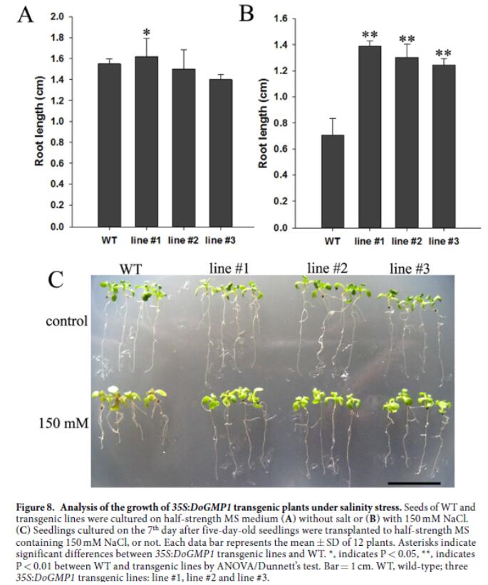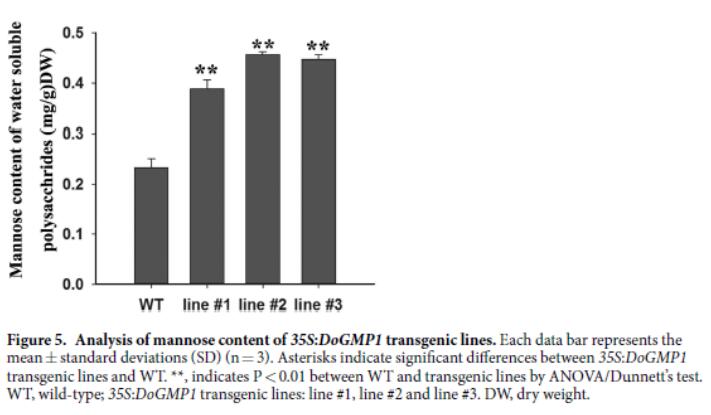 以甘露糖和葡萄糖等单糖为主组成的多糖被认为是铁皮石斛中的主要功效成份之一,在自然界的所有植物中,铁皮石斛中水溶性的多糖含量是最高的,另外,在种植过程中,铁皮石斛还表现出很强的抗逆性。为了深入了解铁皮石斛这些重要性状形成的机制,生物技术育种研究组的何春梅博士在段俊研究员的指导下,对参与多糖合成过程中的关键酶基因GDP-甘露糖焦磷酸化酶基因进行了克隆分析,发现该基因上游1000bp的调控区内含有ABRE、 HSE、LTR、TC-rich repeats和 MBS等多个响应非生物逆境的顺式作用元件,该蛋白定位于细胞质中。构建了DoGMP1 超表达载体,通过转化拟南芥进行转基因功能验证的结果表明,转基因植株的水溶性多糖和水溶性多糖中甘露糖含量大幅度增加,在盐胁迫的条件下,转基因植株种子的萌发率和生长情况均好于野生型。