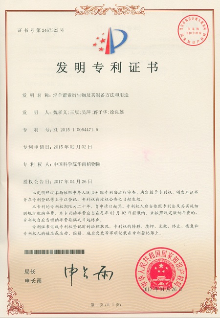 5月12日获悉,由中科院华南植物园魏孝义、吴萍等科研人员完成的“淫羊藿素衍生物及其制备方法和用途”获得国家发明专利授权(专利号:ZL201510054471.5)。
