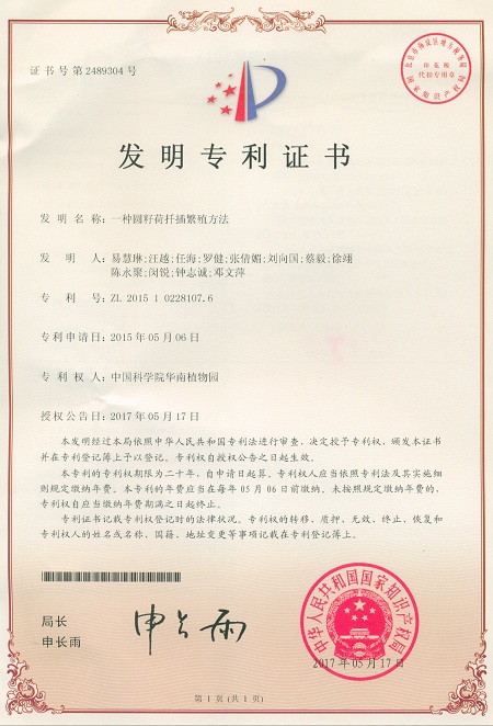 6月7日获悉,由中科院华南植物园任海、张倩媚等科研人员完成的“一种圆籽荷扦插繁殖方法”获得国家发明专利授权(专利号:ZL 201510228107.6)。