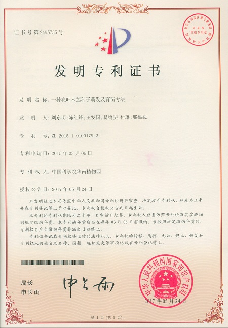 6月22日获悉,由中科院华南植物园刘东明等科研人员完成的“一种亮叶木莲种子萌发及育苗方法”获得国家发明专利授权(专利号:ZL 201510100179.2)。