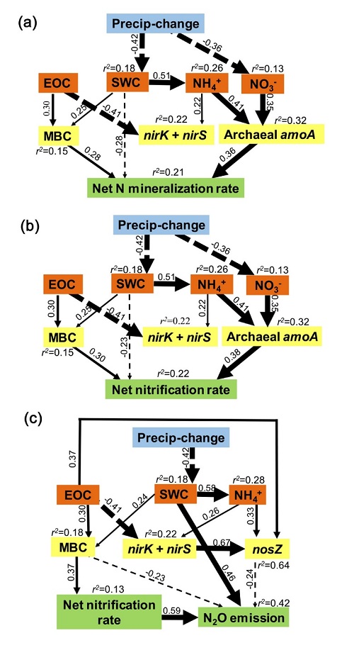图2.季节降水格局变化下,土壤理化性质、氮转化速率和参与氮循环功能基因丰度的相互作用(Precip-change:降水处理;EOC:土壤可提取有机碳;SWC:土壤含水量;MBC:土壤微生量碳;Archaeal amoA: 氨氧化古菌的氨单加氧酶基因;nirK, nirS:亚硝酸还原酶基因;nosZ:氧化亚氮还原酶基因)