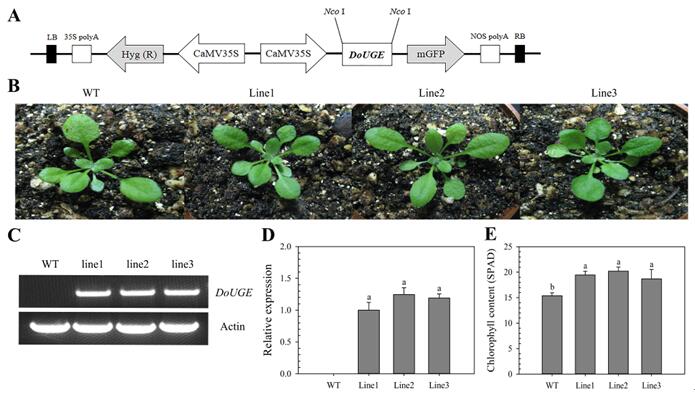 为了揭示铁皮石斛水溶性多糖积累调控的分子机制。华南植物园生物技术育种研究组俞振明博士在段俊研究员的指导下,对参与铁皮石斛水溶性多糖合成过程中的关键酶(UDP-葡萄糖4-差向异构酶,UGE,EC 5.1.3.2)基因进行了克隆和功能分析。研究发现,该基因定位于细胞质中,其转录水平与茎中水溶性多糖含量呈现显著正相关(R2?=?0.94,p?<?0.01),并在其上游启动子区域发现了HSE、MBS、TC-rich repeats和CCAAT-box等多个响应逆境胁迫的顺式作用元件。构建了pCAMBIA1302-DoUGE超表达载体,通过转化拟南芥进行转基因功能验证的结果表明,转基因植株的水溶性多糖含量,以及水溶性多糖中的葡萄糖、半乳糖含量大幅度增加,在盐胁迫和干旱胁迫条件下,转基因植株的生长状况优于野生型。