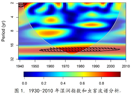 中科院华南植物园生态及环境科学研究中心黄建国研究员指导研究生运用线性和非线性混合模型及小波分析等手段,对上千公里纬度梯度(52oN-58oN)杨树群落径向生长对气候变化响应关系开展系统研究,开创性的量化了1930-2010年间虫害和干旱对寒带林杨树生长衰退的贡献,发现:在发生持续干旱的时段,干旱和虫害的贡献率分别为98%和2%,而在未曾发生持续干旱的时段,干旱和虫害的贡献率分别为73%和27%(图1和图2)。该研究准确揭示了气候变暖诱导的干旱是近几十年来北半球森林衰退和死亡的主要贡献者,因此预期通过准确预报干旱发生的频度可有效管理北半球正在衰的森林生态系统以及实现林业可持续发展。