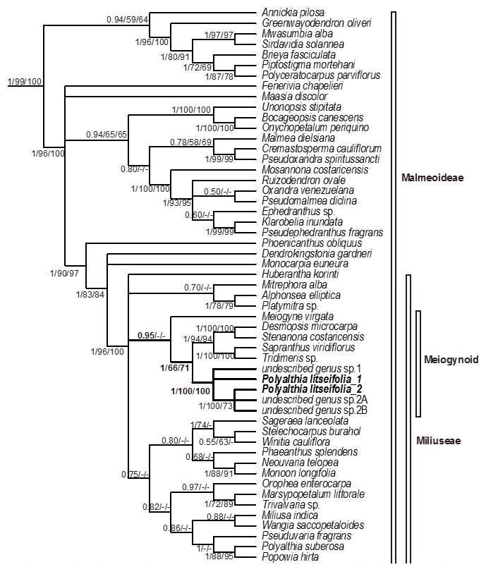 图1. 基于七个叶绿体片段和贝叶斯方法构建的系统发育关系,示木姜叶暗罗(Polyalthia litseifolia)的系统位置