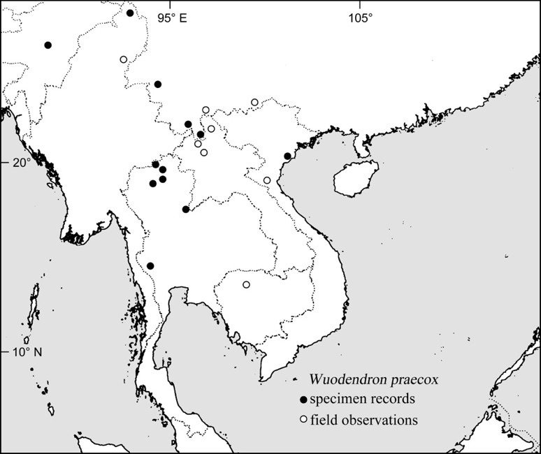分歧时间估算结果表明征镒木属与其姐妹群分支的分歧发生在中新世14–12 Ma, 为北方森林之后的扩散与隔离导致植物类群在热带大洲间的间断分布格局形成提供了一个新的实例。此外,基于广泛的标本查阅及野外考察工作发现该新属分布不局限于中国,而是广布于印度-缅甸生物多样性热点地区(Indo-Burma hotspot) (图3)。然而尽管其分布范围广,各地区均观测到其种群个体数量急剧减少,尤其上世纪八九十年代被大量砍伐,其生存繁衍也因热带雨林生境的破坏受到严重威胁 。根据IUCN濒危物种红皮书标准,将其评估为濒危 (Endangered, En)