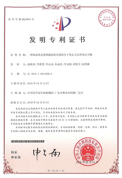 华南植物园“一种海南黄花梨和越南黄花梨的分子鉴定方法和鉴定引物”获发明专利