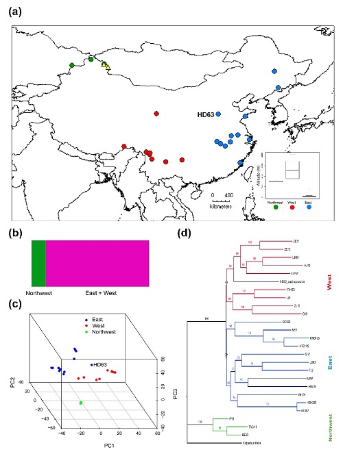 图1:中国荠菜的地理分布和遗传结构。(a)地理分布,圆形表示荠菜,蓝色、红色和绿色分别代表来自东部、西部和西北的荠菜,黄色三角形表示Capsella orientalis居群;(b)STRUCTURE分析推断分为2组:西北地区和其它地区;(c)主成分聚类分析推断分为三组:西北、西部和东部;(d)最大似然法建树分组与主成分聚类分析基本一致。