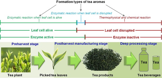 图1 茶叶香气在采前阶段、采后加工阶段和深加工阶段中不同的形成类型