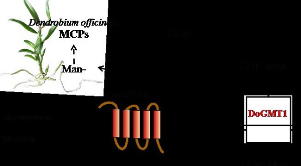 在细胞质中合成的GDP-甘露糖和GDP-葡萄糖是铁皮石斛甘露聚糖合成的供体。然而,铁皮石斛甘露聚糖的合成在高尔基体中进行,为了明确GDP-甘露糖从细胞质中转运到高尔基体中的机制,中科院华南植物园俞振明博士后在段俊和杨子银研究员的指导下,从铁皮石斛转录组数据库中挖掘得到3个甘露糖转运蛋白家族成员DoGMT1,DoGMT2,DoGMT3,它们均有GDP-甘露糖结合位点GXL/VNK motif,科研人员的表达与多糖的积累有良好的相关性(皮尔森相关系数R2分别为0.93、0.92和0.96,p<0.05),其中DoGMT1、DoGMT2与拟南芥AtGMT3、AtGMT4亲缘关系较近,而DoGMT3与拟南芥的AtGMT1、AtGMT2亲缘关系较近。运用酵母突变体对这些甘露糖转运蛋白的功能进行验证发现,它们均有转运GDP-甘露糖的能力。可依据该研究的结果推导出甘露糖转运蛋白参与铁皮石斛甘露聚糖合成的调控模型。