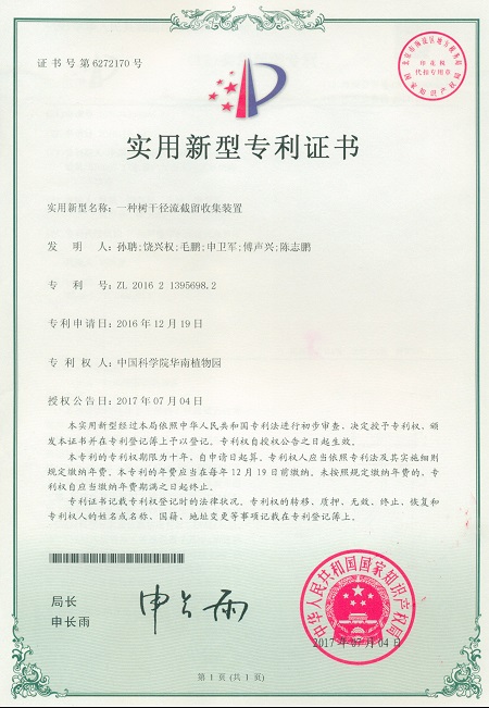 12月12日获悉,由中科院华南植物园孙聃、饶兴权等科研人员完成的“一种树干径流截留收集装置”获得国家实用新型专利授权(专利号:ZL201621395698.2)。