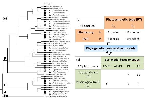 图 南亚热带禾本科42个物种的系统发育树、类型划分及最优系统发育比较分析模型汇总。(a) 四个亚科Arundinoideae (A); Panicoideae (P); Chloridoideae (C) and Pooideae (Po)、光合作用类型(PT, C3植物为白色圆点, C4植物为黑色圆点)和生活史类型(AP, 一年生植物为白色三角, 多年生植物为黑色三角);(b, c) 最优系统发育比较模型显示AP和PT互作解释了叶片导水率,AP解释了大部分结构和生理性状。