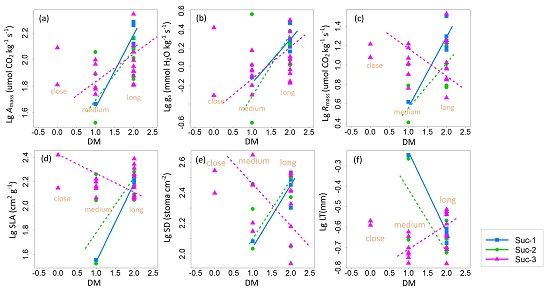图1.果实扩散模式(DM)与其他性状在不同演替阶段的线性关系