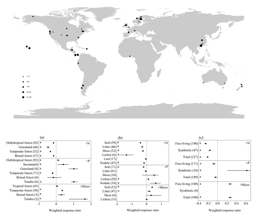 中科院华南植物园生态中心郑棉海博士后在莫江明研究员的指导下,通过收集和整合分析全球不同自然生态系统(热带/亚热带森林、温带森林、北方森林、草地和苔原)、不同基质(土壤、凋落物、苔藓、地衣、叶片和根瘤)和不同固氮类型(自由固氮和共生固氮)对养分(氮、磷和微量元素)输入的响应格局;同时分析养分添加措施(养分添加速率、持续时间和输入总量)和环境因子(温度、降雨和氮沉降)对以上这些响应格局的作用。研究表明,氮添加抑制生态系统生物固氮(?19%),微量养分添加促进生态系统生物固氮(+30.4%),而磷添加对生物固氮的影响取决于生态系统、基质和固氮类型。研究进一步发现中高纬度生态系统生物固氮对养分输入的响应(32.9?61.3%)比低纬度生态系统的响应(8.5?36.9%)更敏感,并且中高纬度生态系统生物固氮的响应随着纬度降低而减弱。此外,研究还揭示了养分添加措施没有影响生物固氮的响应,但环境因子显著影响生物固氮对养分输入的响应;即随着温度、降雨量和大气氮沉降速率的增加,中高纬度生态系统(低温、低降雨和低氮沉降区域)生物固氮对养分输入的响应减弱。