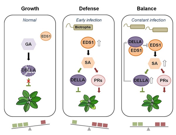 中科院华南植物园分子生物分析及遗传改良研究中心组助理研究员李宇歌博士在侯兴亮研究员的指导下,对植物协调生长-防御平衡调控课题开展了长期观察和研究。DELLA蛋白是赤霉素(GA)信号途径的核心负调控因子,在众多植物生长发育过程中扮演抑制角色,同时也参与植物逆境胁迫响应的调控。该研究通过酵母双杂交筛选发现,DELLA蛋白可与植物关键抗病因子EDS1发生蛋白互作;进一步分析证实DELLA-EDS1模块在植物面临活体营养型菌Pst DC3000侵染时发挥生物学功能;在EDS1存在的情况下,病菌及水杨酸(SA)可稳定DELLA蛋白免遭GA的降解,以此抑制植物的生长;而DELLA可抑制EDS1对下游靶基因启动子的结合,来抑制抗病基因的表达。