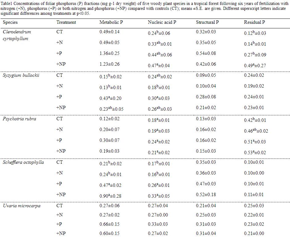 研究发现,叶片氮磷比的结果表明该森林是磷限制的生态系统,施磷降低了叶片磷利用效率和比叶重但增加了叶片磷和氮的浓度,而施氮对叶片性状无显著影响。施磷仅增加了一个广布种的叶片光合能力而对其他四个狭布种无显著影响。进一步对叶片磷组分的研究发现,施磷处理增加了所有物种的代谢磷、结构磷和核酸磷组分,但其增加的尺度因种而异。