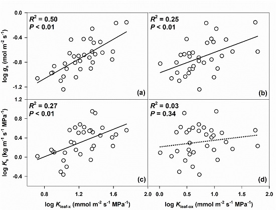 图1. 叶片木质部水分运输效率(Kleaf-x)和叶片木质部外组织水分运输效率(Kleaf-ox)分别与气孔导度(gs)(a、b)以及枝条水分运输效率(Ks)(c、d)的相关关系。