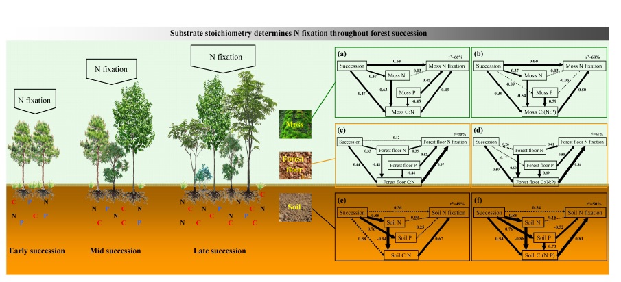 中科院华南植物园生态中心博士后郑棉海等人在莫江明研究员指导下,选择鼎湖山三个处于不同演替阶段的森林开展研究,测定三个森林的多种基质(土壤、凋落物和苔藓)的固氮速率,发现随着森林演替的进行,虽然基质氮的浓度增加并且磷限制也加剧,生物固氮速率没有减少反而增加。通过线性回归模型分析发现,基质氮或磷的浓度没有直接影响固氮速率,而基质碳氮和碳氮磷计量比可以解释固氮速率的变化。通过结构方程模型分析表明,森林演替过程通过改变基质的资源化学计量比驱动生物固氮。研究团队以鹤山、石门台和鼎湖山等多个不同年龄梯度(30~400年)森林再次进行研究也得到了类似结论,即森林发展过程通过改变基质的资源化学计量比驱动生物固氮。