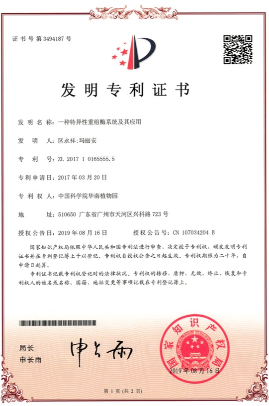 华南植物园“一种特异性重组酶系统及其应用”获发明专利