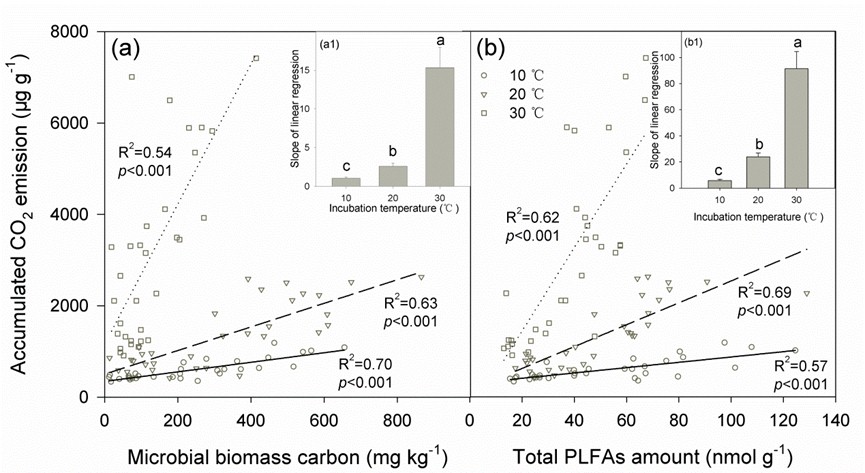 图1. 不同培养温度下土壤微生物生物量与微生物呼吸间的线性关系