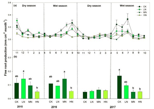 图2. 细根生产量动态变化对氮沉降的响应(微根管)