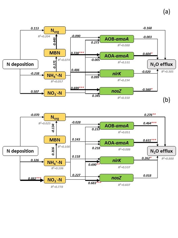 热带和亚热带森林地区被认为是氧化亚氮(N2O)的主要自然排放源之一。在我国南亚热带地区,年降水分配不均以及持续高氮沉降的特点显著影响了土壤氮转化过程,从而潜在增加南亚热带森林土壤氮素的损失(淋溶和温室气体排放)。土壤氮转化包括氮矿化,硝化和反硝化过程,均由土壤微生物介导。然而,在全球变化背景下微生物如何调控氮转化过程尚不明确。