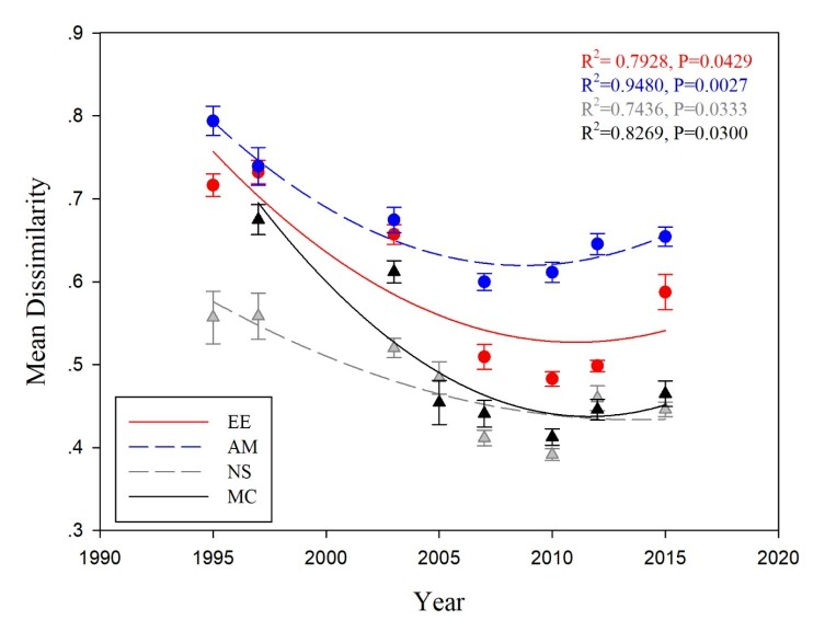 图1.1995-2015年间,四种林分群落组成平均差异值随时间变化。