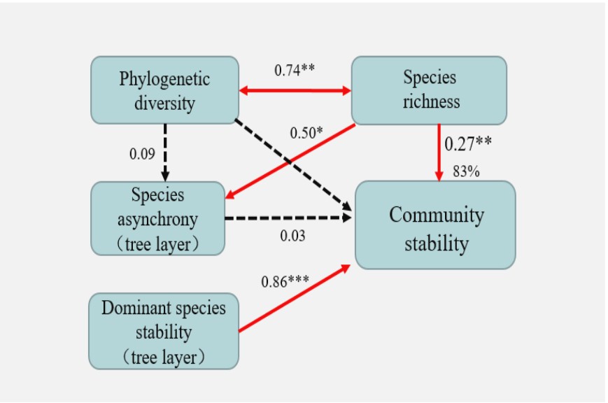 图2.群落稳定性与谱系多样性、物种多样性、乔木层物种异步性和优势物种稳定性关系的结构方程模型分析。