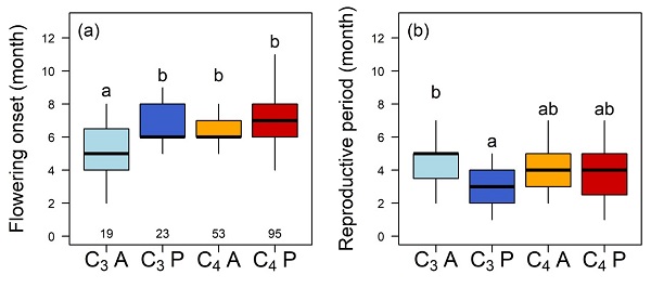 C4P:多年生C4植物。取样量在(a)中箱线下方,四组开花开始时间(flowering onset)