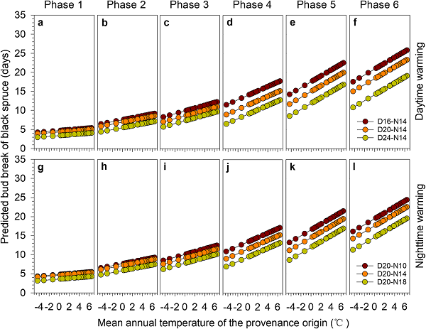 图1 由一般线性模型(GLM)预测的来自不同采集地的黑云杉幼苗在不同的白天(D)和夜晚(N)增温处理下的发芽物候