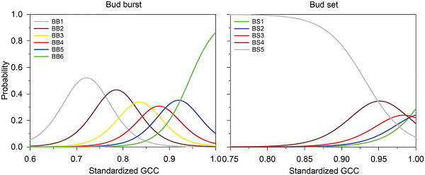 图2. 芽的各个物候期(包括发芽-BB和芽的形成-BS的各个时期)沿标准化GCC绿度指数的概率估计