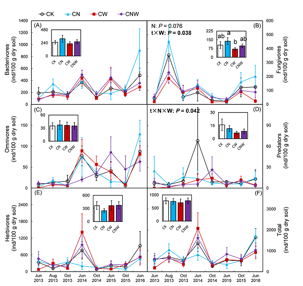 图 氮添加(CN),增雨(CW)和同时加氮增雨(CNW)对土壤线虫各类群个体密度的影响