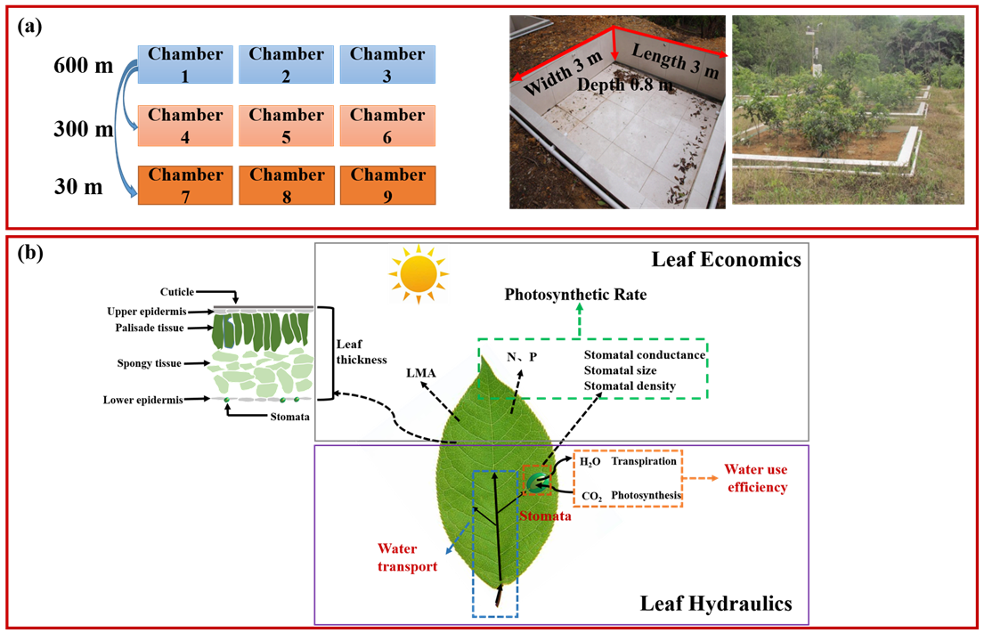 图:(a) 实验样地介绍; (b) 增温可影响叶片水力特性和经济学特性机理