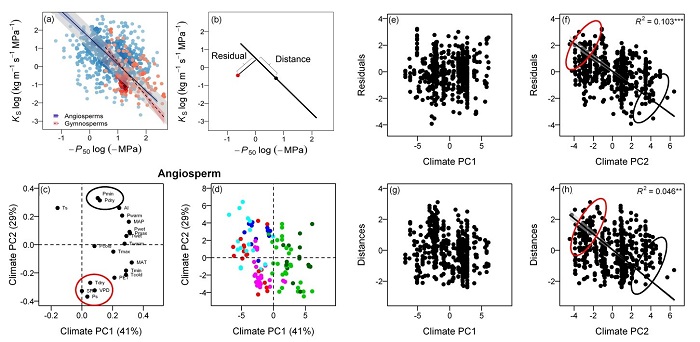 中科院华南植物园生态中心全球变化与植物功能性状研究组刘慧副研究员,建立了全球178个样地682个木本植物的水力效率和安全性及样地气候和土壤环境因子的数据库,基于多种模型分析,探讨植物水分的效率-安全权衡关系的驱动因子。研究发现:无论是被子植物或裸子植物,生长在高气候季节性(尤其是降水季节性)区域的植物,比气候季节性差异不明显区域的植物具有更高的水力效率和安全性,其中湿季较高的饱和水汽压差、较强的太阳辐射和较低的降水是关键驱动因子,从而揭示了气候季节性差异促使植物向拥有更高的水力效率和水力安全性的方向演化,而气候季节性差异不明显的生境则允许水力效率和水力安全较低物种的生存。