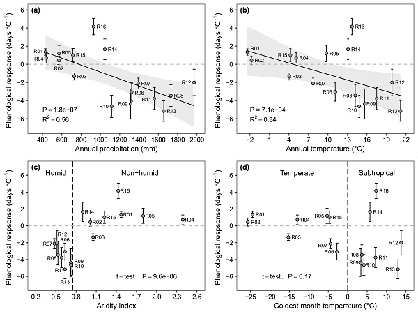 (d)物候温度敏感性在温带与亚热带气候之间不存在显著差异。