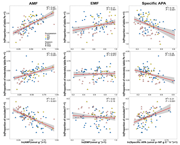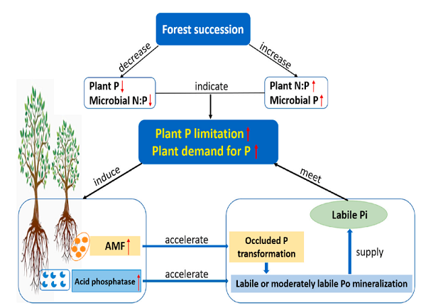 中科院华南植物园生态中心柳杨博士在温达志研究员指导下,基于前期对全球626个未受施肥等人工干预的自然土壤分析的发现:固相不稳定无机磷(Pi)和闭蓄态(occluded P)向中活性、活性有机磷(Po)转化,而非传统认知的可溶性磷在土壤磷供给中的核心作用(Hou et al., Global Biogeochemical Cycles, 2016),但作用机制并不清楚。为此,科研人员采集了在鼎湖山自然保护区内森林演替前期、中期和后期的优势树种叶和根际土壤样本,测定了叶P浓度和根际土壤指标包括微生物生物量磷(MBP)、 P分级提取组分、酸性磷酸酶活性、丛枝菌根真菌(AMF)和外生菌根真菌(EMF)的生物量。研究结果表明:(1)在森林演替早期至后期的过程中植物磷限制增加而微生物磷限制得到缓解;(2)根际土壤闭蓄态P比例的降低与AMF生物量的增加呈负相关,有机磷和中度不稳定磷的增加与AMF生物量的增加呈正相关,但与森林演替过程中酸性磷酸酶活性的增加呈负相关(图1)。该研究提出了南亚热带森林演替过程中植物磷获取机制,即AMF促进闭蓄态P向活性、中活性Po转变,酸性磷酸酶进一步将可水解Po转变成有效P供植物吸收利用(图2)。