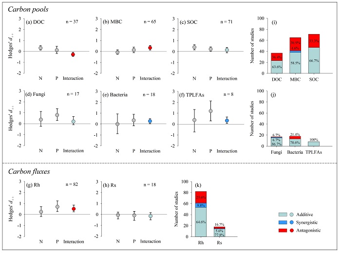 中科院华南植物园生态中心江军博士在王应平研究员和闫俊华研究员的指导下,遴选了全球158篇氮磷施肥全因子实验 (control+N+P+NP) 的研究论文,以编译的1928个有效观测数据为基础,运用meta分析方法,将氮磷交互作用划分为协同效应(synergistic)、对抗效应(antagonistic)和可加效应(additive),全面评估了8个地下碳循环关键变量(DOCMBCSOCfungal/bacterial/total microbial biomassRhRs)对氮磷交互作用的响应。研究发现,地下碳循环过程对氮磷交互作用的响应以对抗和可加为主,氮磷交互作用促进了土壤有机碳的积累。