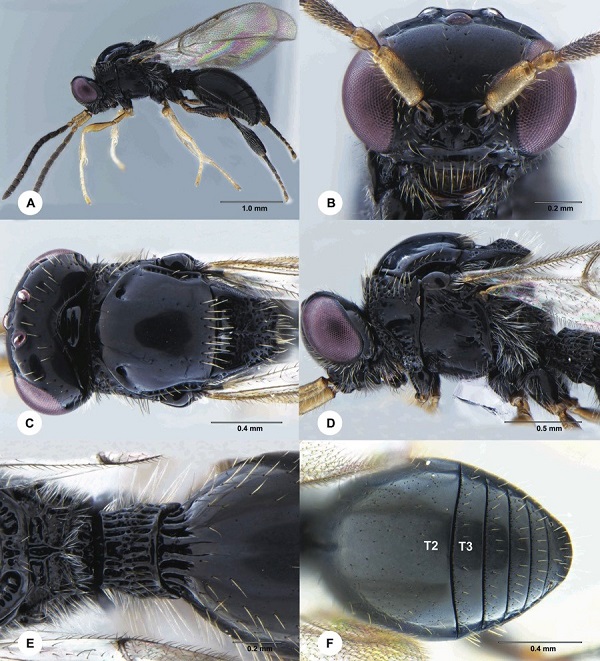 图1. 巨点寄螯细蜂Ismarus areolatus Chen, 2021,雌,正模. 种名根据中胸小盾片密布大的凹点(见图2C)而拟。(图引自Zhang et al. 2021)