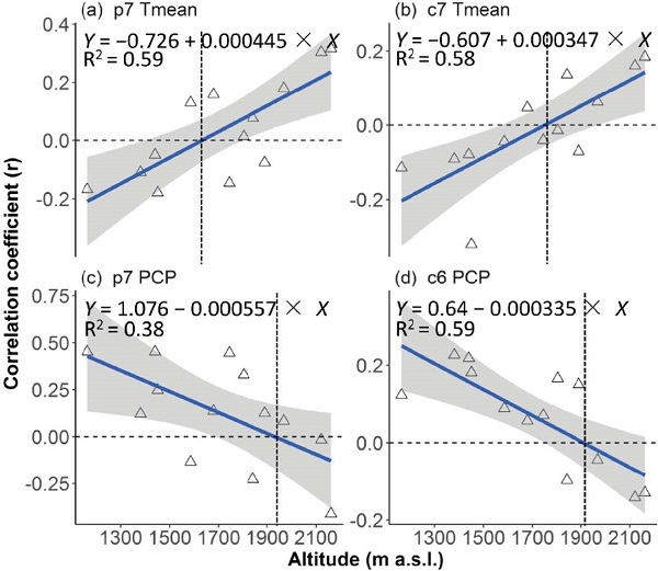 研究结果发现,13个西伯利亚落叶松年表可分为高海拔和低海拔两组。在低海拔组中,当年4月的干旱指数(scPDSI)、上年9月的平均温度和上年7月的温差共解释了西伯利亚落叶松径向生长变异的63%,其中scPDSI是最主要的限制因素,其相对贡献率为63%。在高海拔组中,当年1月最高温度、上年7月的降水和当年6月最低温度共解释了西伯利亚落叶松径向生长变异的38%。此外,气候因子和径向生长之间的相关关系随海拔的变化有显著变化(图)。根据预测,随着阿尔泰山脉的气候变湿和变暖,西伯利亚落叶松在1800至1900 m的海拔高度可能会受益于暖湿天气而生长更好。研究结果将为全球气候变化下的区域可持续森林管理提供科学依据。