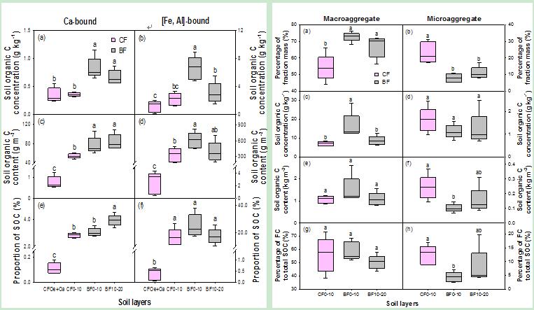 图1. 南亚热带原始林(BF)和人工林(CF)土壤矿物结合有机碳与团聚体有机碳的分配格局。