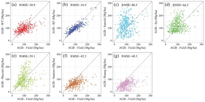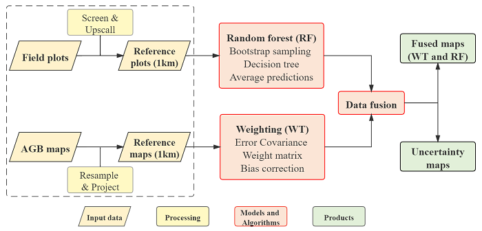 华南植物园生态中心常中兵博士(鼎湖山站)在闫俊华研究员和王应平研究员的指导下,通过多源数据(森林清查数据、专项样地调查数据、遥感反演数据)融合研究中国森林地上碳储量及其空间分布,采用线性加权模型和随机森林回归两种方法估算的中国森林地上碳储量分别为7.73 Pg C和8.13 Pg C,并基于空间分布规律生成我国森林地上碳储量数据产品,通过交叉验证结果表明本项研究生成的森林地上碳储量产品具有更高的精度。本研究结果是优化森林碳汇管理方案的关键资料,是评估我国未来森林固碳潜力的数据基础,为实现我国“双碳目标”服务。