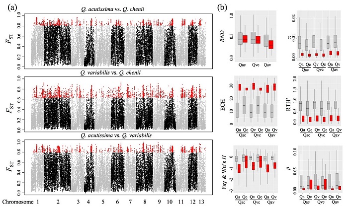 研究以我国分布的三个栎属物种:麻栎(Quercus acutissima)、栓皮栎(Quercus variabilis)和小叶栎(Quercus chenii)为研究对象,对100多个个体进行全基因组测序,获得了1600多万个SNP位点。群体历史分析发现,这三个物种间的分化时间始于中新世(Miocene)晚期,其后各物种在更新世(Pleistocene)冰期经历了一系列的瓶颈效应。通过对多个群体遗传学参数的联合分析,结合计算机模拟,我们证实了选择性清除和背景选择是导致基因组变异的重要力量,它们在不同基因组区域所起的相对作用是不同的。选择性清除降低有利变异位点周围的遗传多样性水平,促进种间基因组高分化区域的产生;背景选择对基因组变异的影响更为广泛,决定了基因组的背景变异模式。
