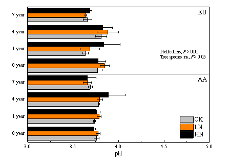 图1. 桉林(EU)和相思林(AA) 0-10土层的pH值对7年氮添加的响应