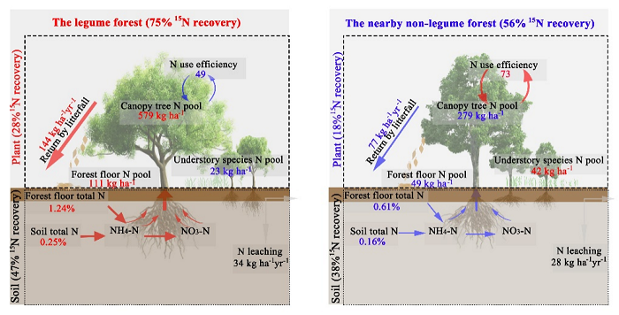 中科院华南植物园生态中心毛晋花博士等在郑棉海副研究员和莫江明研究员的指导下,以广东省鹤山长期(10年)氮沉降样地为试验平台,选取豆科种植林(Acacia auriculiformis)和非豆科林(Eucalyptus urophylla)为试验对象,首次开展了生态系统尺度的15N标记实验。通过为期1年的15NH415NO3持续喷施,对比了外源输入氮(大气沉降氮和氮添加)在两个森林不同组分中的留存和分配模式。研究发现 “富氮”的豆科林对大气沉降氮仍具有很高的留存潜力,且豆科林生态系统总15N回收率显著高于非豆科林。矿质土是大气沉降氮的主要汇,但土壤回收率在两个森林中不存在显著差异。豆科林相对于非豆科林较高的生态系统15N回收率主要是由豆科树种驱动。此外,长期氮添加没有改变两个森林的氮留存模式。研究结果表明“富氮”豆科林对大气沉降氮有较高的留存潜力,而豆科树种在生态系统截留外源氮中发挥主要作用。该研究强调了将豆科主导森林纳入地球系统氮循环模型的必要性,用以准确评估全球氮沉降对陆地生态系统的生态学效应。