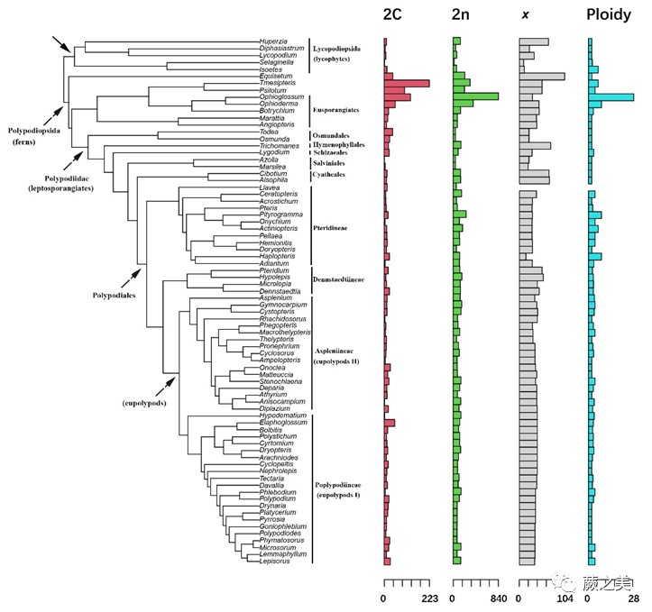 图1. 石松类和蕨类植物96属的基因组大小、染色体数目、染色体基数和倍性水平的系统发育分析。