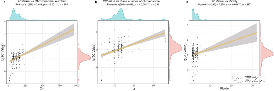 图2. 基因组大小与染色体特征的相关性回归分析。