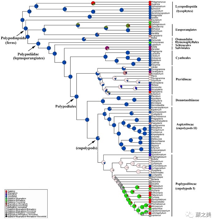 图3. 基于石松类和蕨类植物96属系统发育的不同生境类型祖先状态重建。