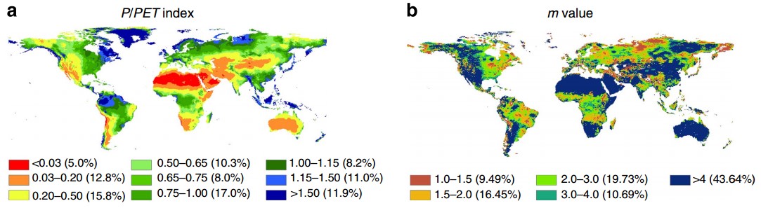 图1:湿润指数(a)和下垫面参数(b)的全球分布图